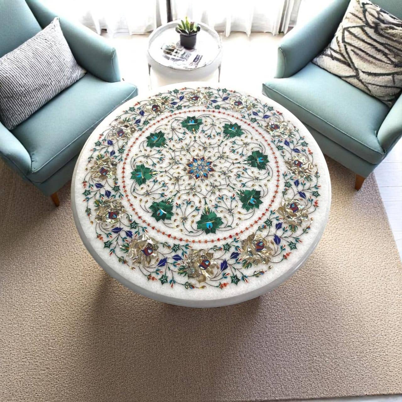 Bring timeless elegance to your home with this exquisite handcrafted round marble inlay table, featuring intricate Pietra Dura (stone inlay) work by skilled artisans from Agra, India – the land of the Taj Mahal.